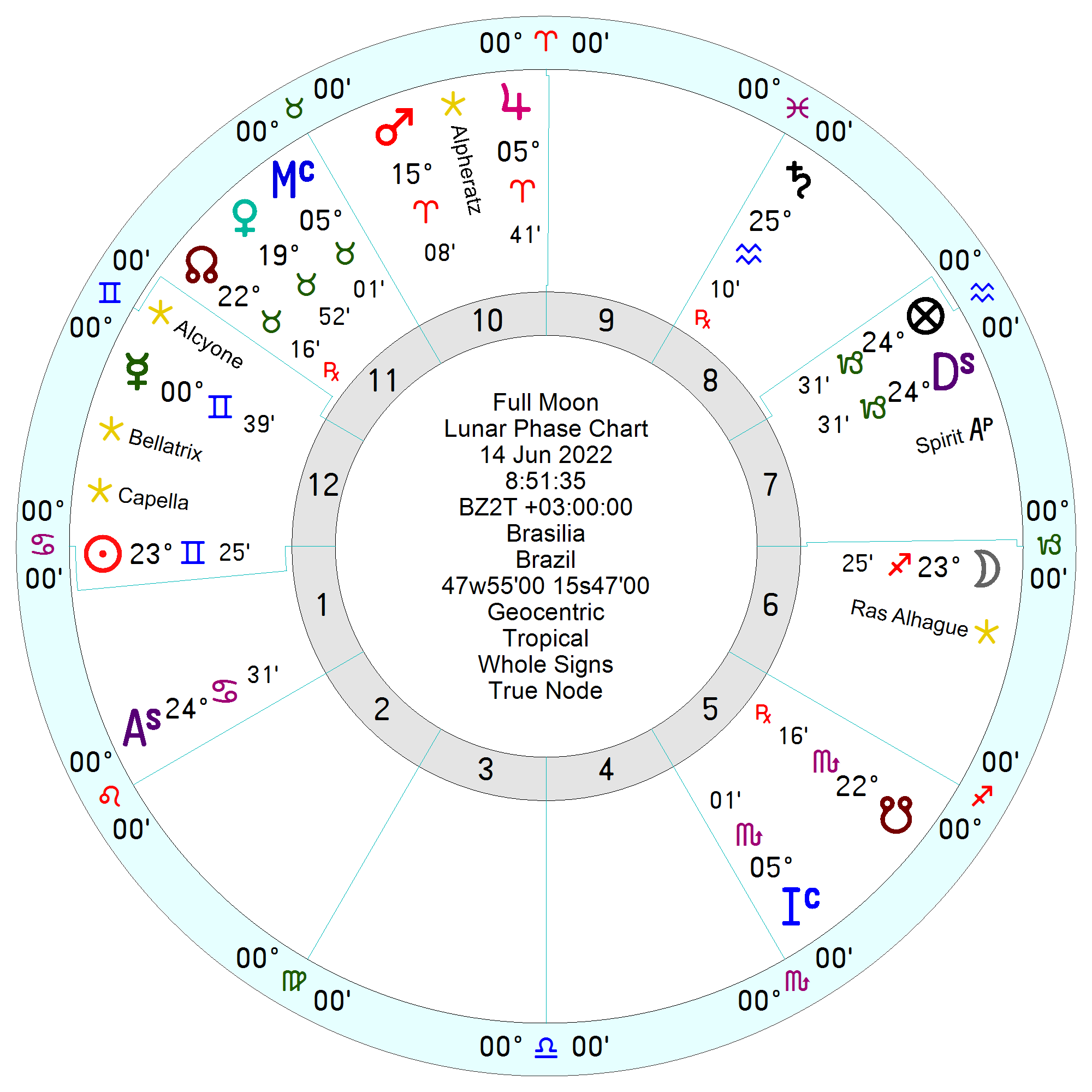 A Lua Cheia ocorre, naturalmente, na casa 6, em oposição ao Sol: ela está ativando outra estrela fixa, essa chamada Ras Alhague, tradicionalmente associada à medicina, venenos e cura (estava ativa no eclipse solar de dezembro de 2020, anunciando a chegada da vacina para COVID-19 no Brasil). No contexto, me parece que esse aspecto pode tanto significar pressão sobre assuntos de alimentos e agrotóxicos, quanto um fortalecimento ou ampliação da vacinação contra doenças (as viroses respiratórias estão a todo vapor, especialmente entre as crianças menores, mais um efeito negativo oriundo do último eclipse). A vacinação contra influenza, inclusive, já está disponível para a ampla população em vários municípios. Vacinem-se!