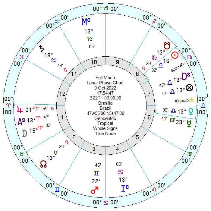 A Lua Cheia em Áries chega no fim da tarde desse domingo, abrindo para o Brasil um mapa razoavelmente parecido com o que iniciou esse ciclo, na Lua Nova em Libra. No entanto, algumas diferenças são bem visíveis: se na Lua Nova a oposição ao governo vinha regida por uma Lua Nova em Libra, mal aspectada e sem boas recepções, nessa Lua Cheia ela está em Áries, num aspecto favorável ao Marte em Gêmeos que governa esse mapa: um bom indício de melhora e crescimento da oposição junto à população de forma geral, fazendo frente ao bolsonarismo. Só que o Marte em Gêmeos, que irá retrogradar na próxima Lunação de Escorpião, já está perdendo velocidade pouco a pouco ao longo do mês de outubro: sua desaceleração e o fato de sua única aliada no mapa ser a Lua não deixa dúvidas de que o momento, para a oposição, é de manter o máximo de união e integridade possíveis.