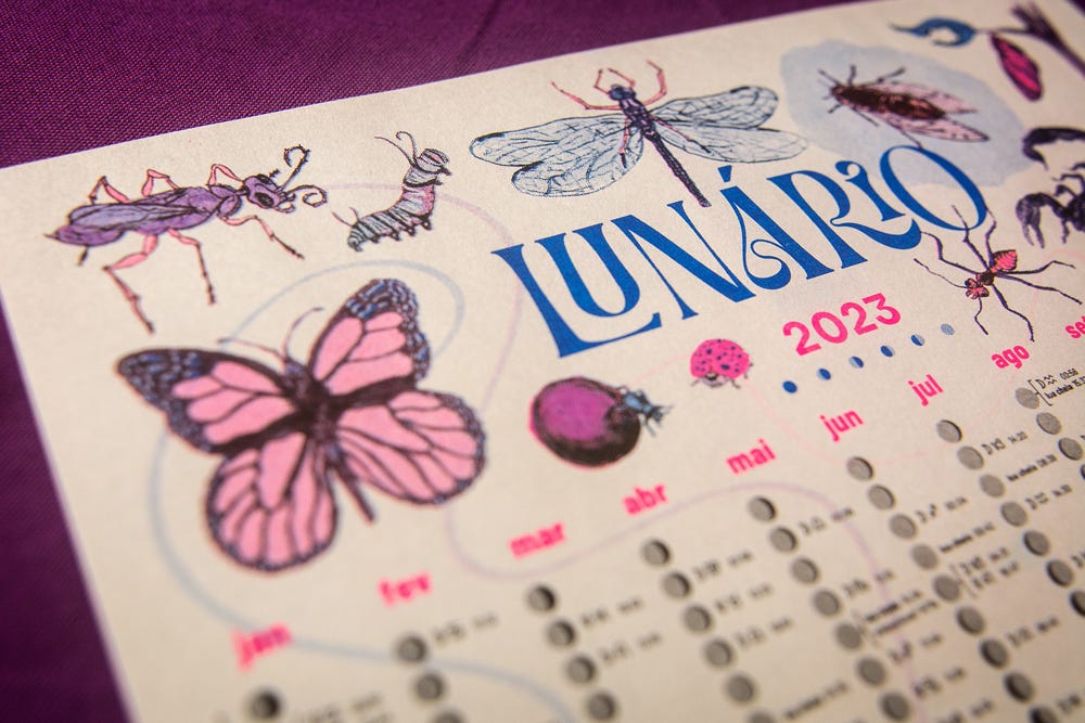 O nosso lunário vem na forma de um cartaz tamanho A3, impresso em risografia nas cores preto, azul e rosa neon. Nesse tipo de impressão, as tintas são transparentes e, quando sobrepostas, fazem novas cores — o que significa que os tons de roxo que você enxerga no lunário são, na verdade, sobreposições do azul e do rosa.