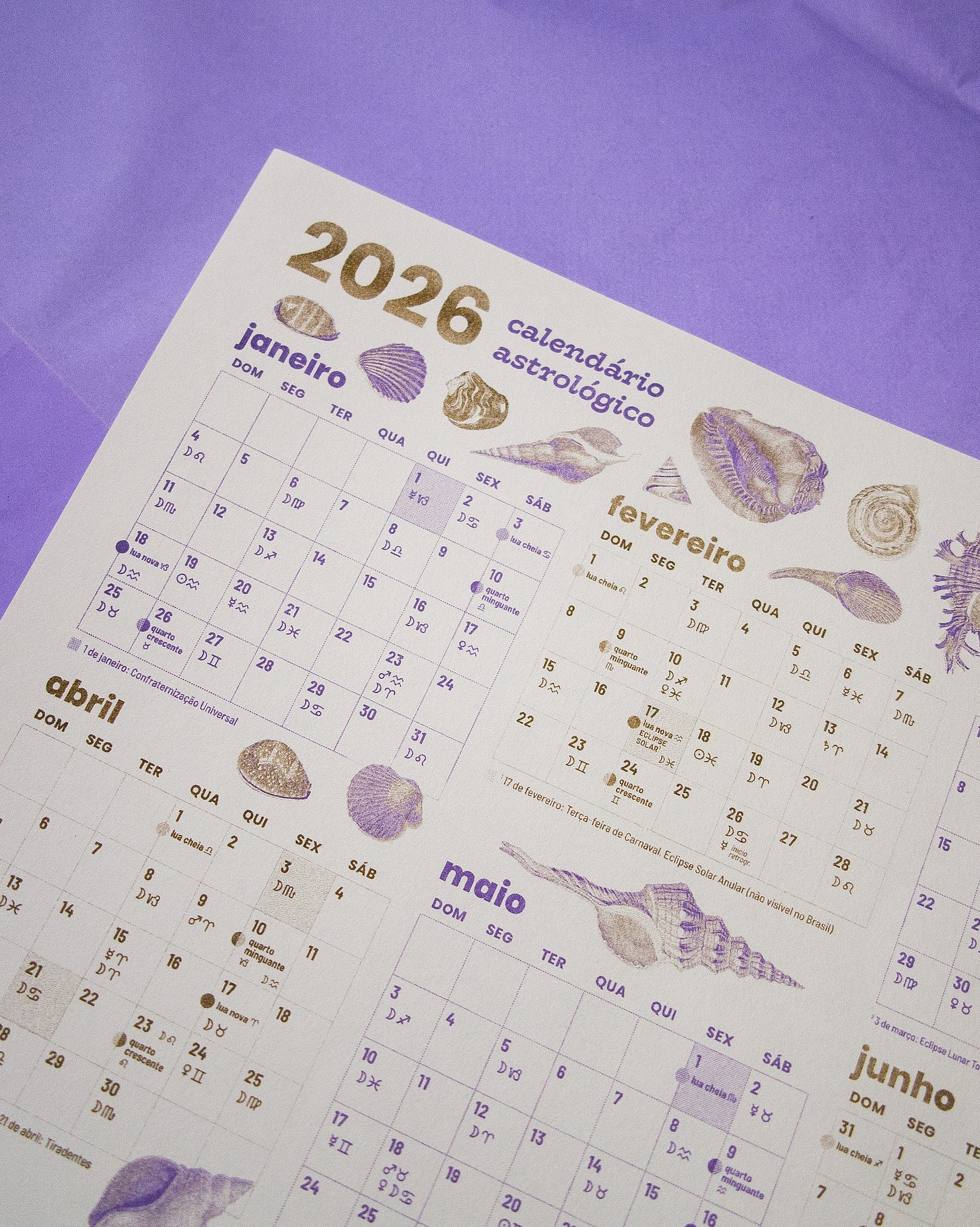 Foi pensando sobre as formas de dividir e lidar com o tempo que, esse ano, decidi transformar o lunário em um calendário astrológico: trazer a informação sobre as fases lunares, eclipses, ingressos planetários e retrogradações para um formato que se aproximasse mais do dia a dia comum das pessoas. Facilitar a visualização desses dois tempos — o celeste e o linear — para que esse seja um instrumento de observação e acompanhamento dos ritmos ao longo do ano.
